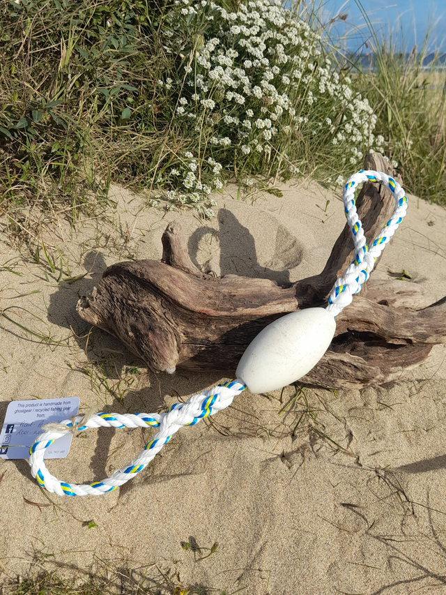 Introducing our handmade floating dog toy that will keep your furry friend entertained for hours at the beach! Made from recycled ghostgear materials, this eco-friendly toy not only benefits your pet, but also the environment. Its buoyant design ensures it stays afloat, making it perfect for fun games of fetch in the water. With its durable construction, this toy can withstand even the toughest play times. Give your beach dog a new favourite toy that is both entertaining and sustainable.